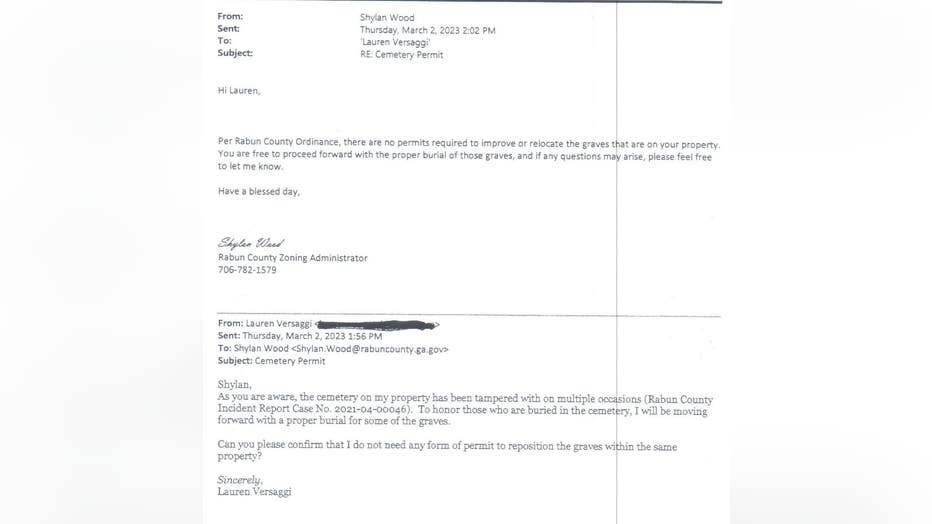 An email between Versaggi and a Rabun County employee asks if she needed a permit "to reposition the graves within the same property?"