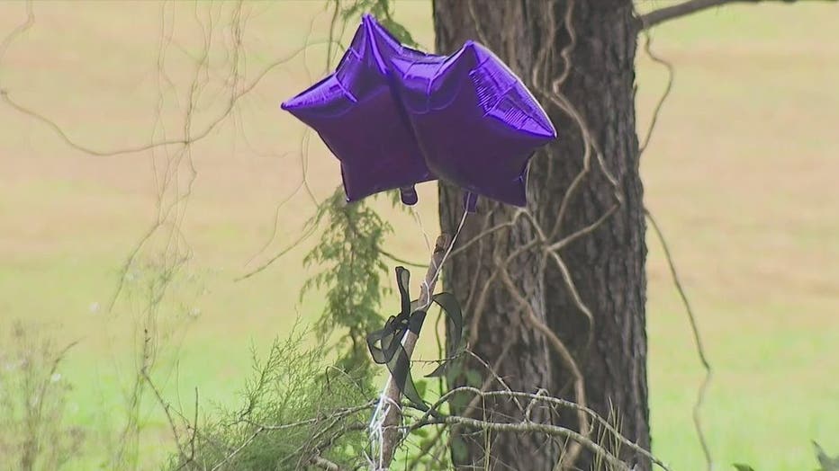 Two balloons mark the tree where Akeila Ware crash after shots were fired at her in Troup County. Ware and her unborn child died from their injuries on Oct. 5, 2021. (FOX 5)