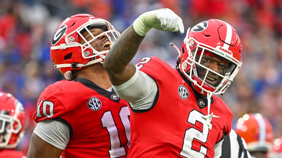 JACKSONVILLE, FL - OCTOBER 29: Georgia Bulldogs linebacker Jamon Dumas-Johnson (10) and Georgia Bulldogs linebacker Smael Mondon Jr. (2) celebrate a big defensive play during the college football game between the Florida Gators and Georgia Bulldogs o
