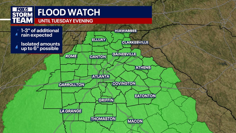 A widespread Flood Watch remains in effect through Tuesday evening for more than 70 Georgia counties as multiple rounds of rain and thunderstorms continue to saturate the state, bringing the risk of flash flooding and keeping temperatures unseasonably cool.
