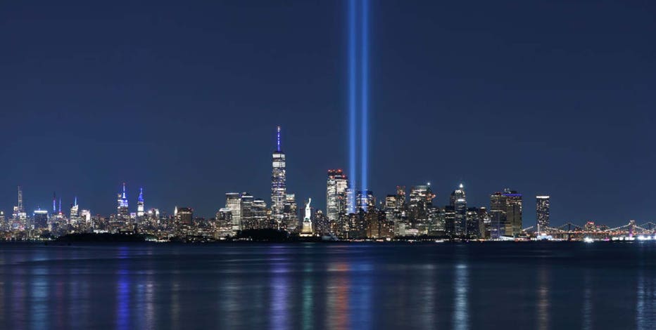 FILE - The annual Tribute in Light is illuminated behind the Statue of Liberty and next to One World Trade Center in New York City on the 20th anniversary of the 9/11 attacks on Sept. 11, 2021 as seen from Jersey City, New Jersey.