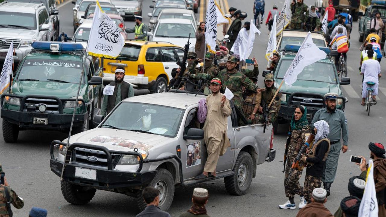 Taliban fighters ride in a convoy near the US embassy in Kabul on Aug. 15, 2022. (Photo by Wakil KOHSAR / AFP) (Photo by WAKIL KOHSAR/AFP via Getty Images)