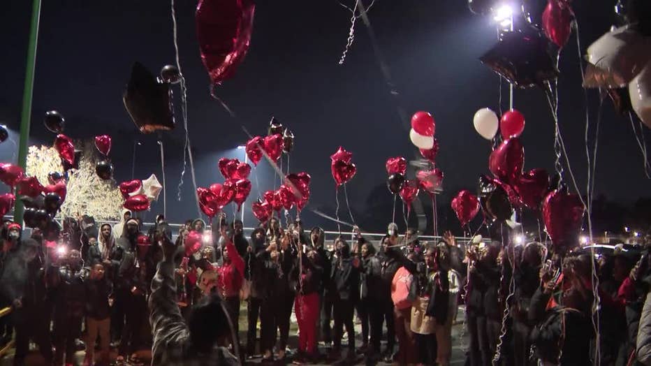 Loved ones released red and black balloons for 17-year-old Anjuan Maffett during a vigil at the shopping center on Dr. Martin Luther King Jr. Drive in southwest Atlanta on Dec. 3, 2025. (FOX 5)