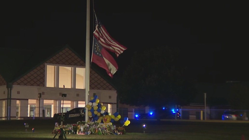 A growing memorial now surrounds the base of the flag pole outside of Apalachee High School as students, alumni, parents, and members of the community come to grieve the tragic loss.