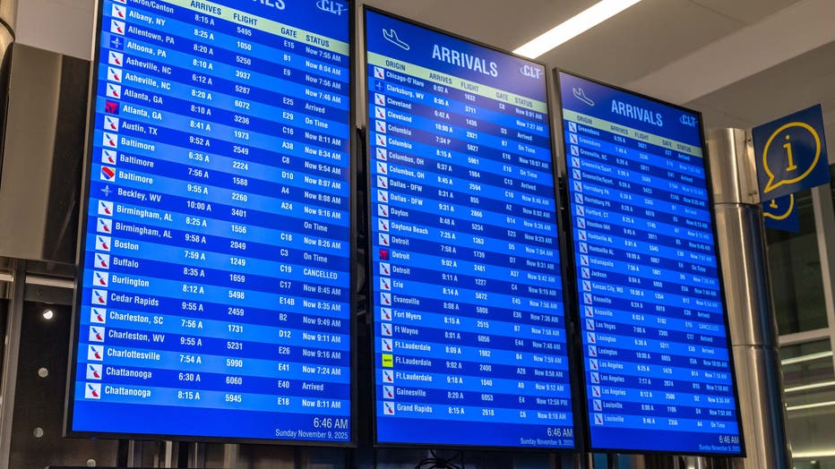 Flight boards indicate few cancelations or delays during the morning rush at Charlotte-Douglas International Airport's (CLT) arrivals level on the morning of Nov. 9, 2025 in Charlotte, North Carolina. The airport's TSA is fully staffed. (Photo by Gra