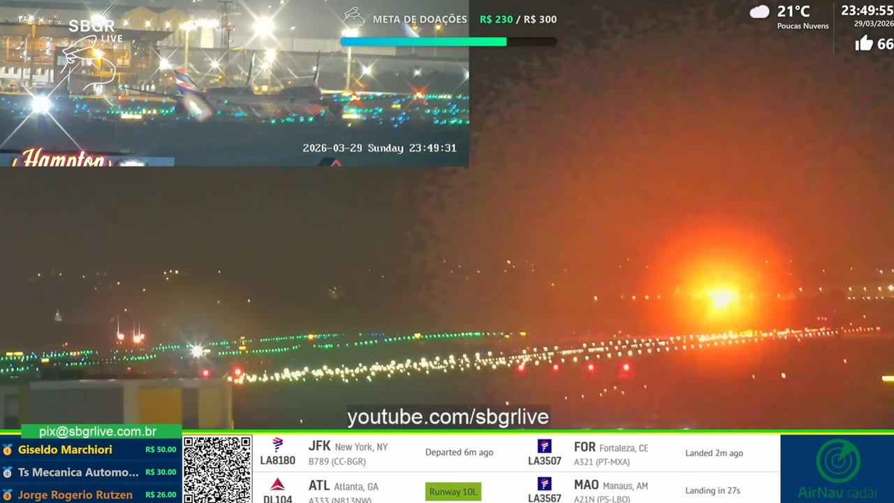 The YouTube channel SBGR LIVE, which broadcasts live from Guarulhos International Airport in São Paulo, caught the moment Delta flight 104’s left engine burst into orange flames during takeoff.
