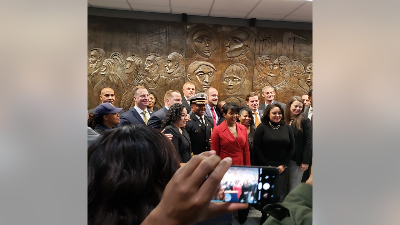Atlanta Mayor Keisha Lance Bottoms poses with fire officials after announcing a major pay raise.