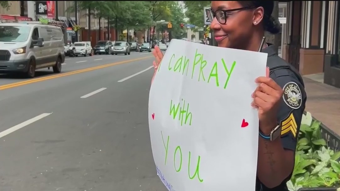 On Wednesday, officers gathered at the corner of Peachtree Street and Andrew Young International Boulevard holding signs that read "I can pray with you" and "Be gentle with yourself today."
