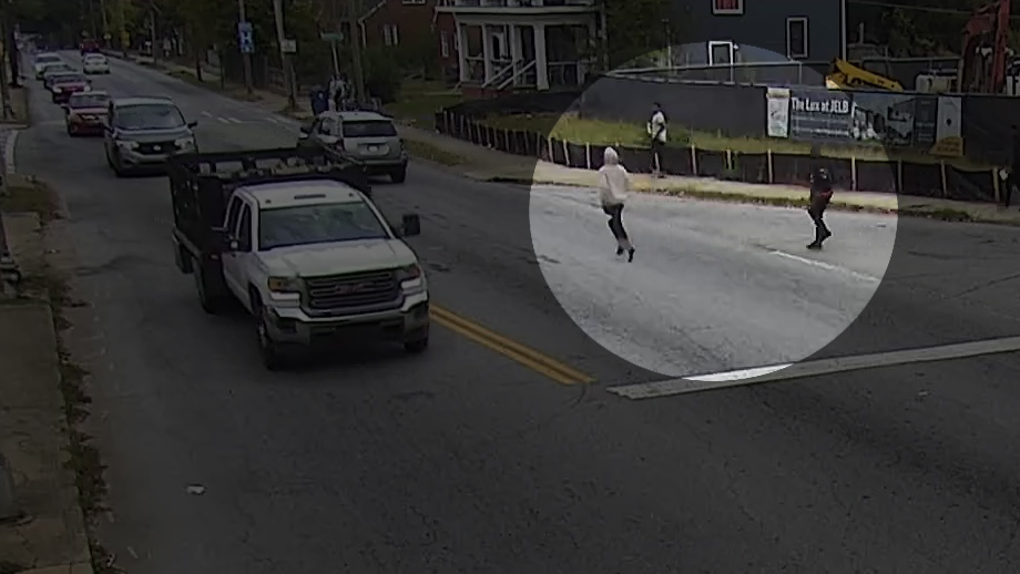 Police shared the video, taken on Oct. 17 on Spencer Street. Police believe two men seen running across the street are connected to a shooting in the area.