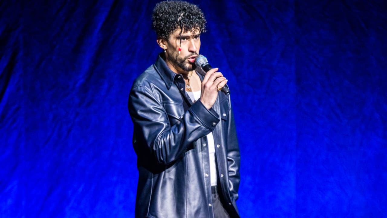 LAS VEGAS, NEVADA - APRIL 25: Bad Bunny speaks onstage during the CinemaCon opening night and Sony Pictures Entertainment presentation during CinemaCon 2022 at Caesars Palace on April 25, 2022 in Las Vegas, Nevada. (Photo by Greg Doherty/Getty Images