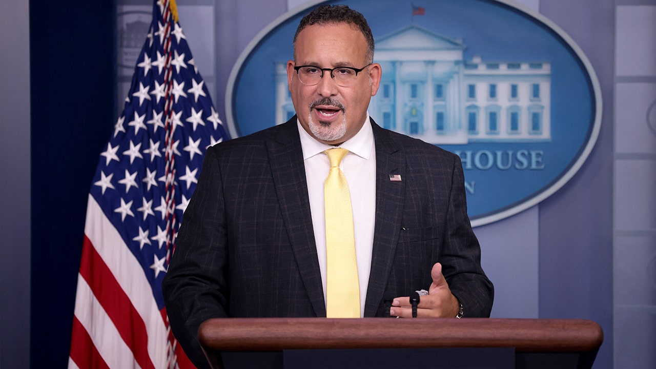 Secretary of Education Dr. Miguel Cardona answers questions during the daily briefing at the White House. (Photo by Win McNamee/Getty Images)