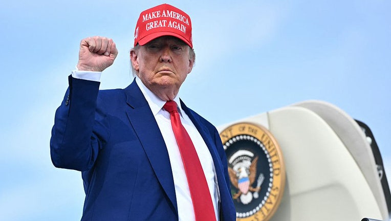 President Donald Trump pumps his fist as he boards Air Force One at Morristown Municipal Airport in Morristown, New Jersey, on June 21, 2025, as he returns to the White House from his golf club in Bedminster, New Jersey. (Photo by MANDEL NGAN/AFP via