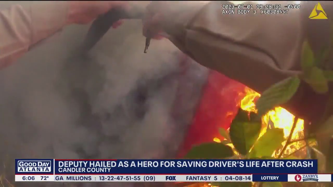 Body camera footage showed the moments a Georgia deputy rescued a driver who was trapped inside a car that quickly went up in flames.