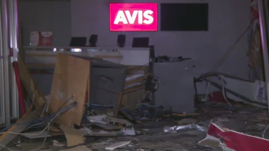 A car slammed into the Avis rental car center at the corner of Cortland and Ellis streets in downtown Atlanta early Friday morning.