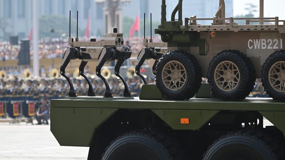 Military vehicles transport a four-legged robot past Tiananmen Square during the military parade to mark the 80th anniversary of the end of the Second World War. (Photo by Johannes Neudecker/via Getty Images)