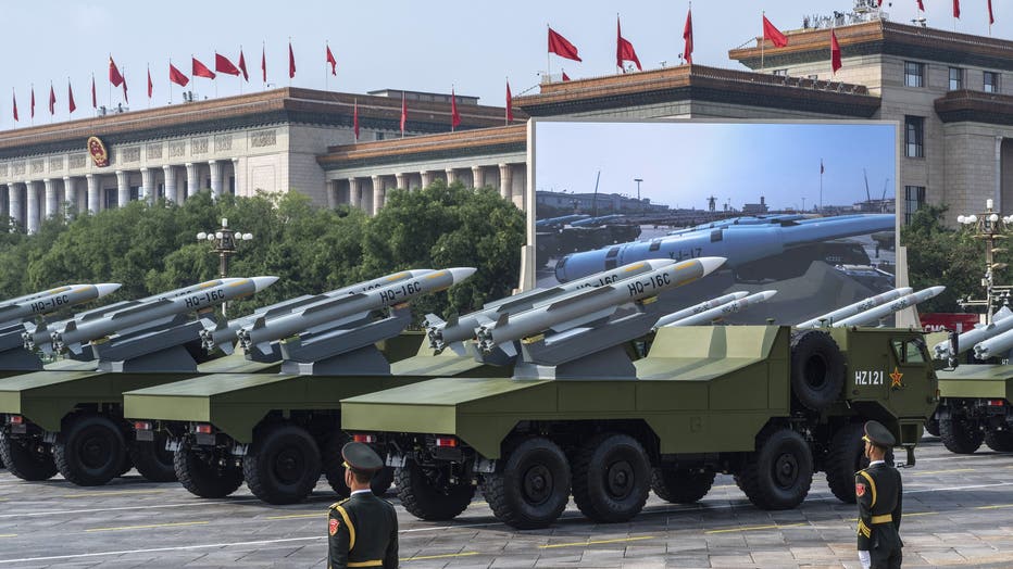 Chinese missile launchers take part in a military parade marking the 80th anniversary of victory over Japan and the end of World War II, in Tiananmen Square on September 3, 2025, in Beijing, China. (Photo by Kevin Frayer/Getty Images)