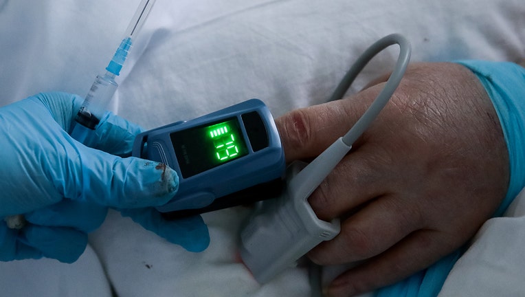 A pulse oximeter on a person's finger at the infectious diseases hospital. (Photo by Kirill KukhmarTASS via Getty Images)