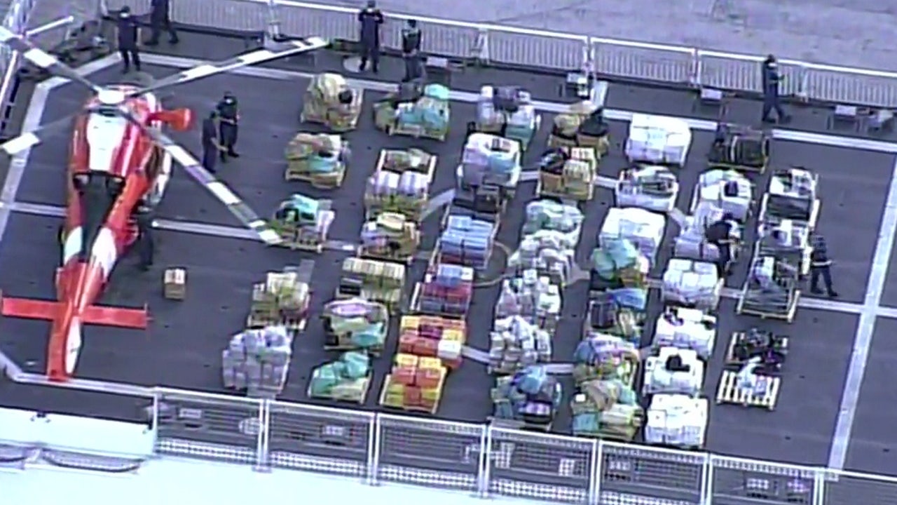 Aerial video from WSVN showed armed officers guarding the confiscated drugs onboard the vessel.