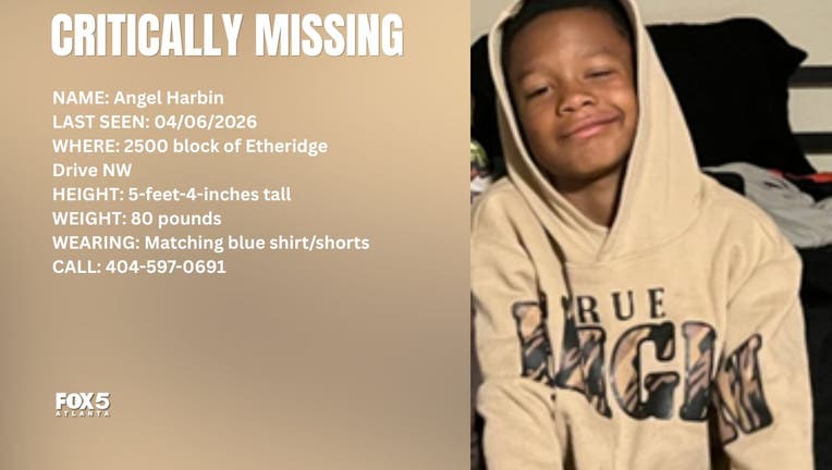 Angel Harbin was last seen April 6 in the 2500 block of Etheridge Drive NW, according to police. Authorities said he is 5-feet-4 inches tall, weighs about 80 pounds and was last seen wearing a matching blue shirt and shorts.