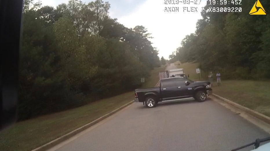 Sheriff’s Office photo of truck blocking a box truck from leaving a neighborhood where the driver was accused of speeding. (Coweta County Sheriff’s Office)