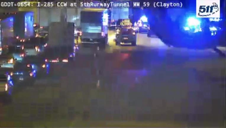 This image shows law enforcement responding to an officer-involved shooting along I-285 East beneath the airport runway tunnel on April 7, 2026. (FOX 5 Atlanta)