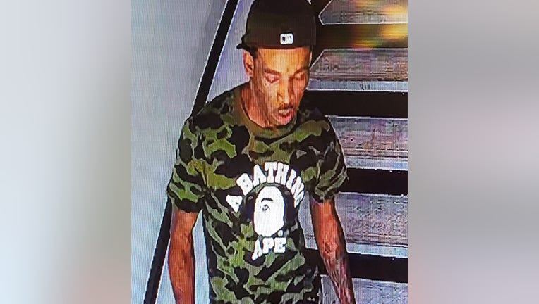 Monday, investigators shared a surveillance photo of a man described as a person of interest in the homicide. The man is seen in the photo on a staircase in the complex wearing a backwards black baseball cap and a green camouflage A Bathing Ape T-shirt.