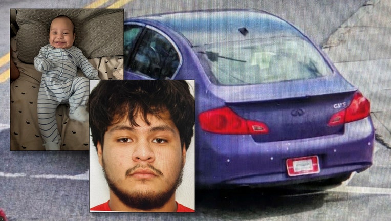Authorities are searching for 18-year-old Antonio Cordova, missing 4-month-old Josiah Rincon, and a purple Infiniti sedan involved in a kidnapping and domestic violence incident at Doraville Plaza on Feb. 2, 2026. (Doraville Police Department)