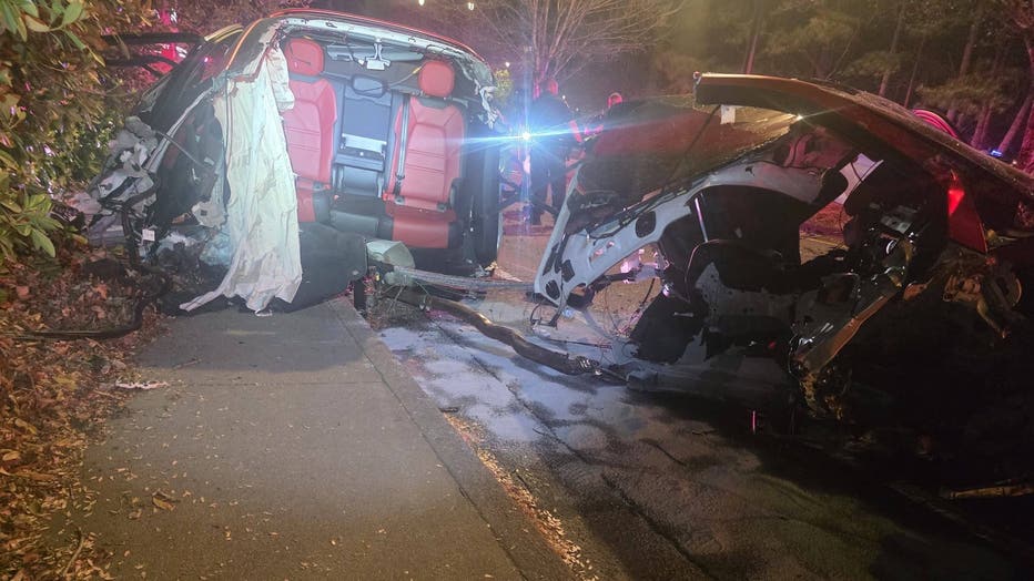 A Porsche driver miraculously survived with minor injuries after their vehicle was sheared in half during a high-speed wreck on Meadow Lane in Dunwoody on March 31, 2026. (Dunwoody Police Department)