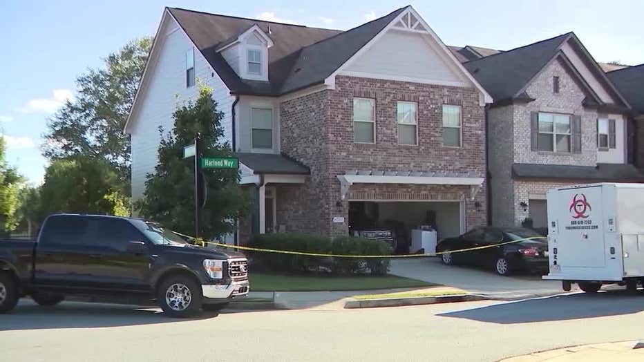 Crime scene tape surrounds a home on Harlond Way in Forsyth County where Gwinnett County Master Deputy Tamara Tuitt-Bartlett was killed on Sept 27, 2025. (FOX 5 Atlanta).