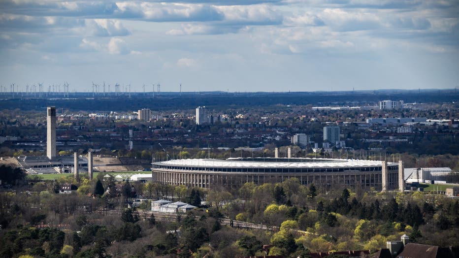 View of the Olympic stadium (Olympistadion) in Berlin taken on April 8, 2025. (Photo by John MACDOUGALL / AFP)