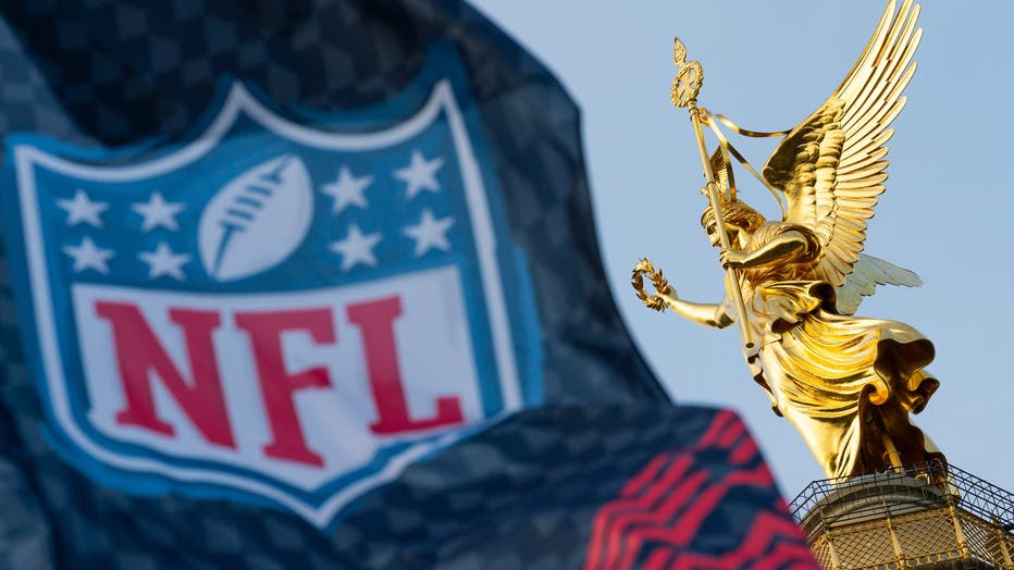 A flag with the logo of the National Football League (NFL) flies in front of the Victory Column with the Victoria sculpture. The NFL's Berlin Game between the Atlanta Falcons and the Indianapolis Colts takes place on November 9. (Photo by Hauke Schrö