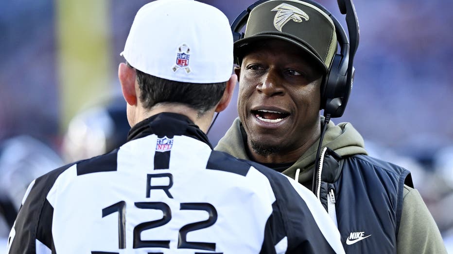 Head coach Raheem Morris of the Atlanta Falcons talks to referee Brad Allen #122 during the third quarter against the New England Patriots at Gillette Stadium on November 02, 2025 in Foxborough, Massachusetts. (Photo by Billie Weiss/Getty Images)
