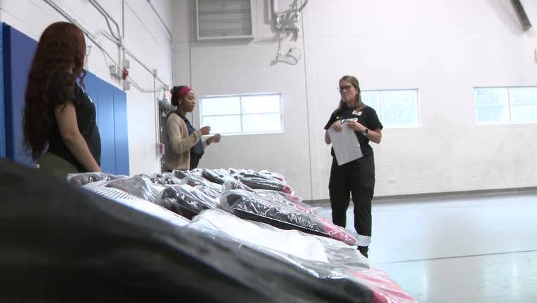 Atlanta Falcons cheerleaders help distribute sports bras at the Warren Boys & Girls Club in southeast Atlanta as part of the team’s FLY:FWD initiative with Operation Warm on Oct. 7, 2025. (FOX 5)