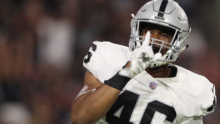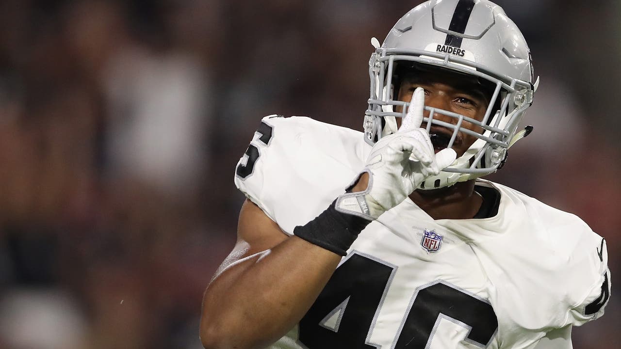 GLENDALE, AZ - AUGUST 12: Linebacker LaTroy Lewis #46 of the Oakland Raiders reacts after a sack against the Arizona Cardinals during the second half of the NFL game at the University of Phoenix Stadium on August 12, 2017 in Glendale, Arizona. The Ca