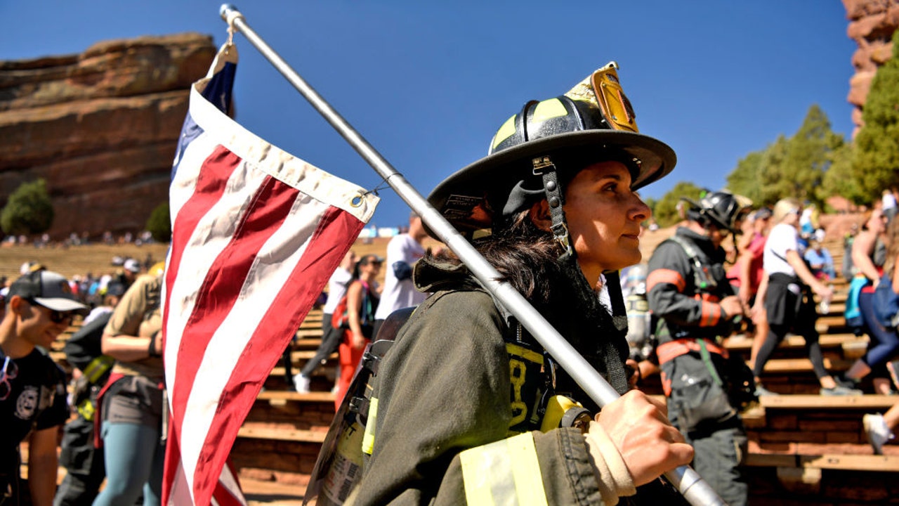 Probationary Golden firefighter Lauren La Bella holds a specially designed 9-11 American flag as she takes part in the 9-11 Memorial Stair Climb at Red Rocks Park and Amphitheatre on September 11, 2022 in Morrison, Colorado. (Photo by Helen H. Richar