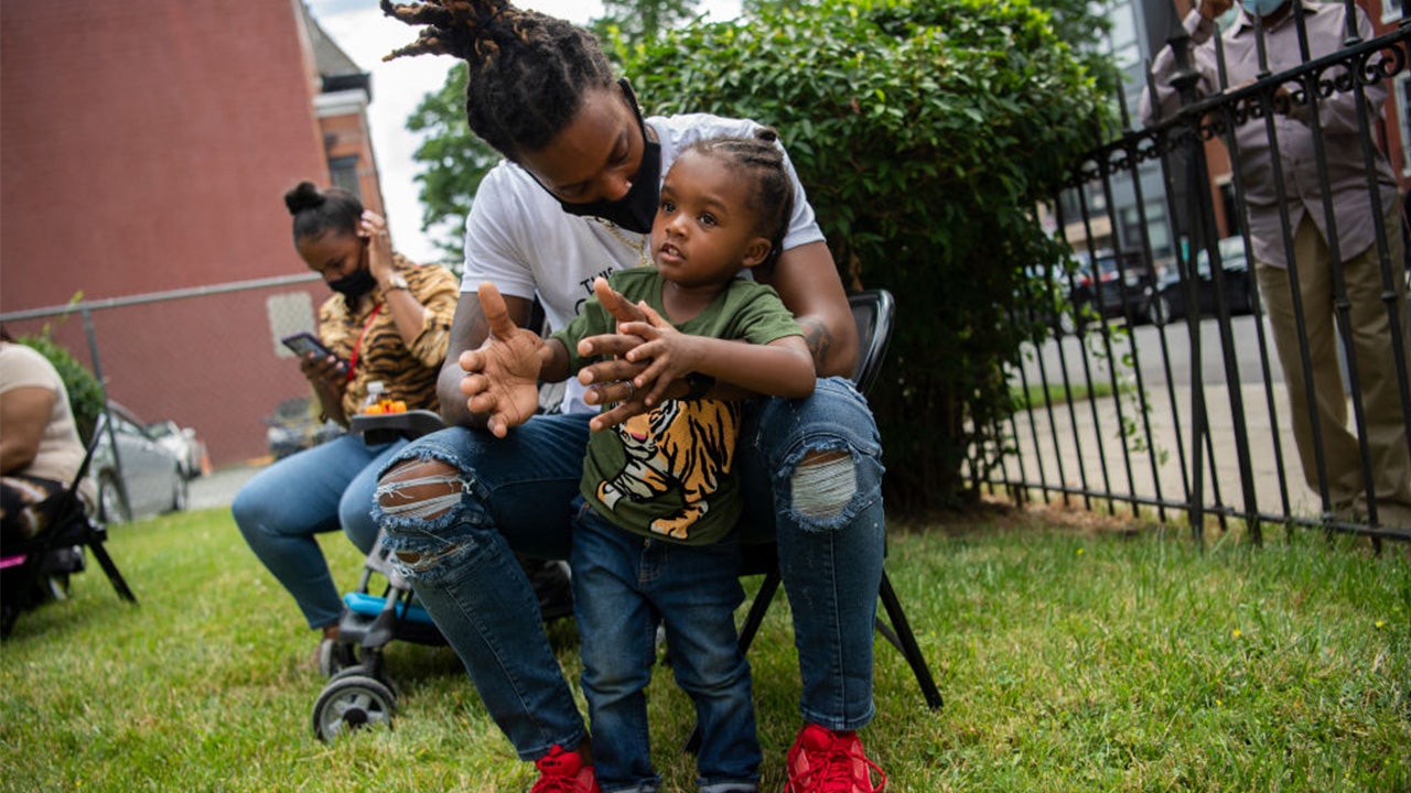 FILE - Sonny Norris and his son, Tru, 3, attend an outdoor Sunday service at Salem Baptist Church in the Shaw neighborhood on Fathers Day, June 21, 2020. (Tom Williams/CQ-Roll Call, Inc via Getty Images)