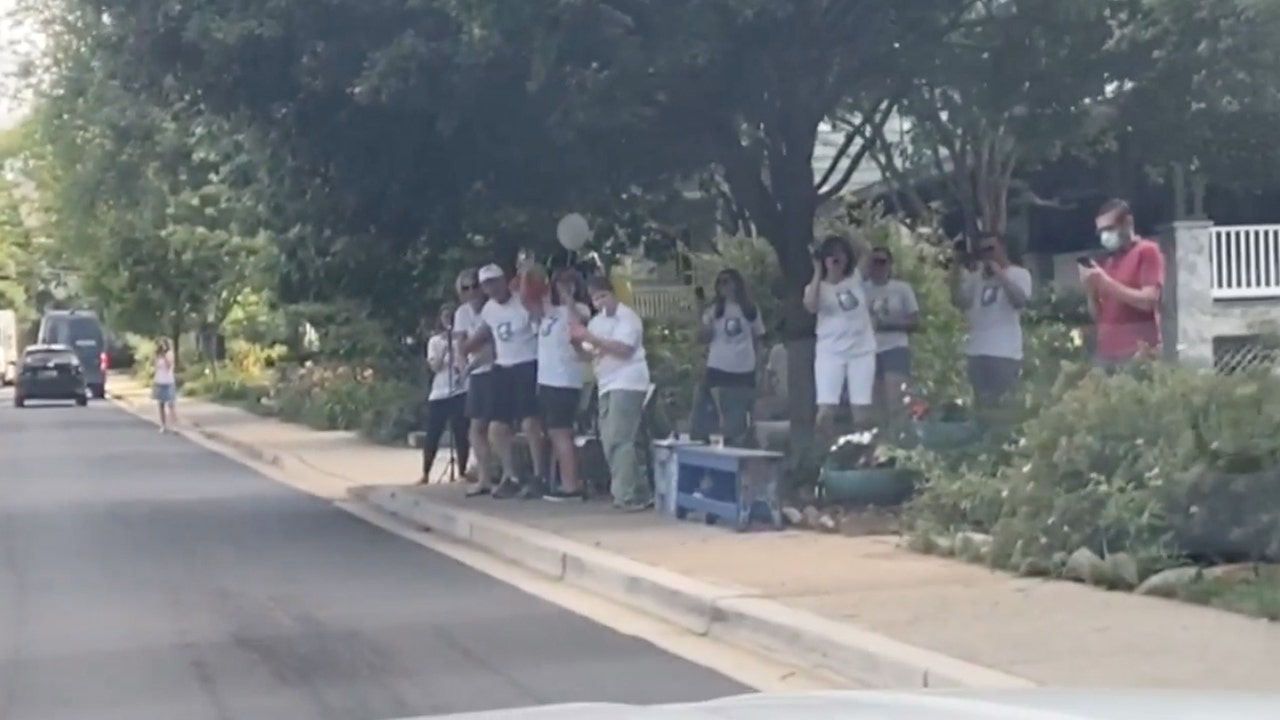 The video shows several police cars and fire department trucks coming down the street with their lights and sirens on. As they approach the Willkens’ home, they are greeted by his family, who are wearing matching shirts and cheering.