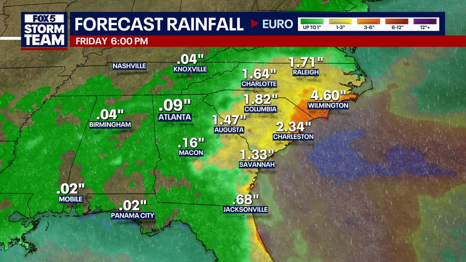 While the system’s exact path remains unclear, the FOX 5 Storm Team says heavy rainfall is a strong possibility in south Georgia, with some reaching metro Atlanta. Both the European and GFS models show several inches of rain for the Carolinas, with some runs hinting at over a foot near the coast.