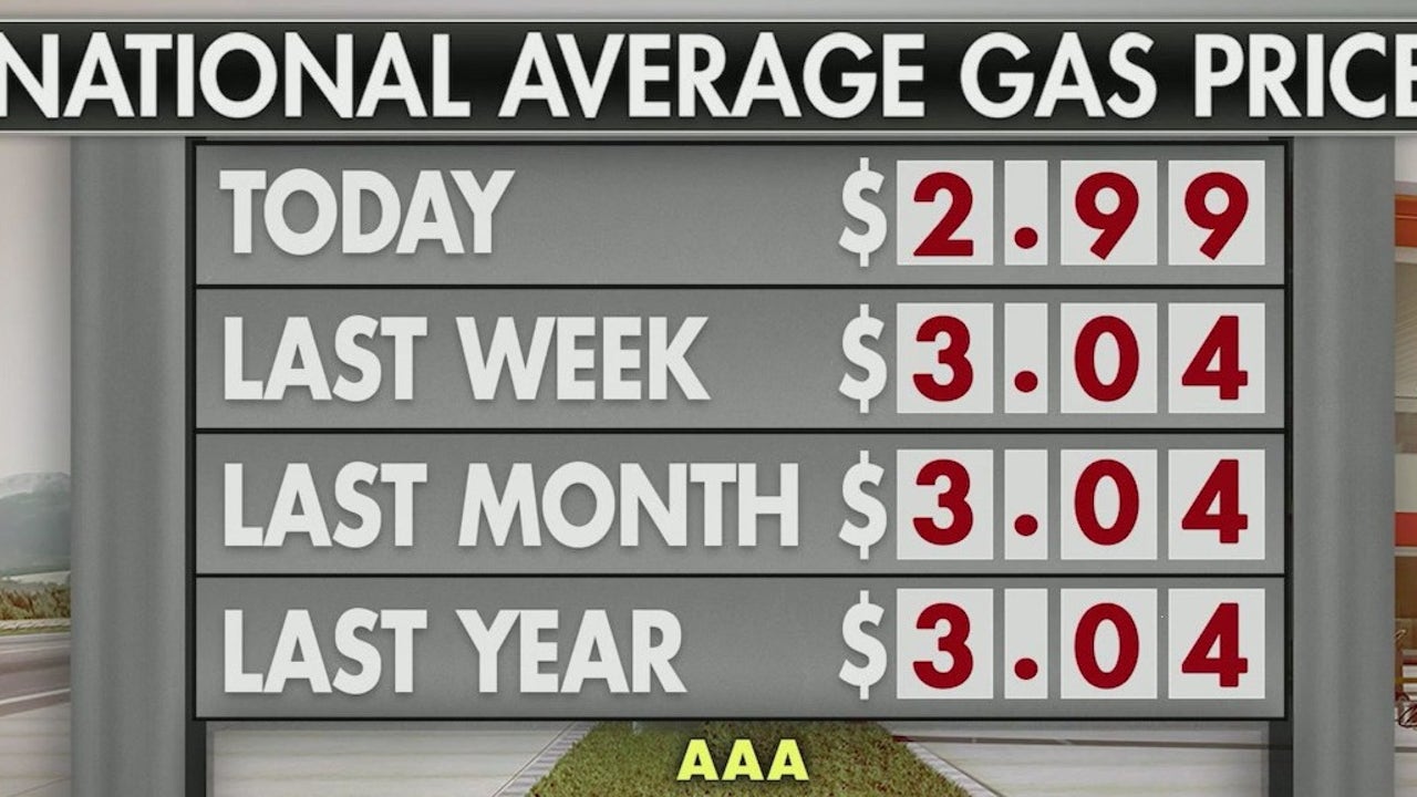 New data show the national average price for regular gas is about $2.99 a gallon, down from roughly $3.04 in recent weeks. GasBuddy’s daily estimate placed Tuesday’s average at about $3.01. Prices have fallen in all 50 states.