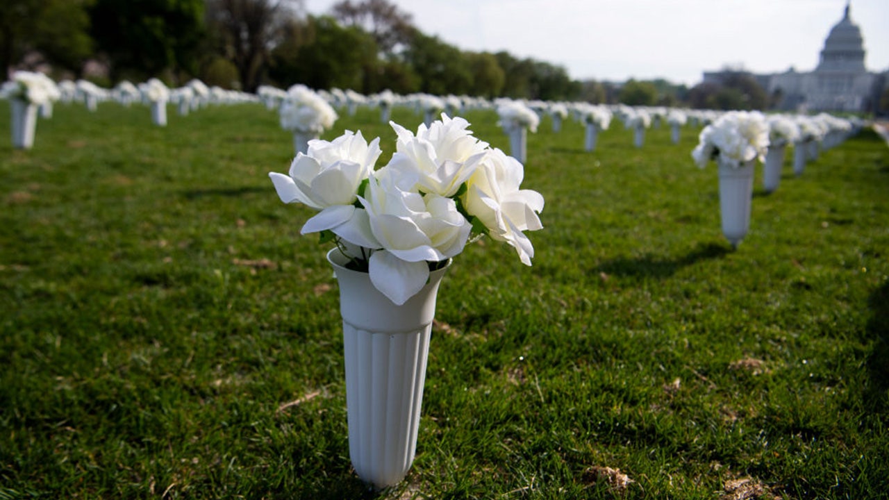 FILE - The Gun Violence Memorial, which is composed of 40,000 flowers that represent the deaths from gun violence in the U.S. each year, is pictured on the mall as members of Congress conducted a news conference to highlight the importance of federal (Tom Williams/CQ-Roll Call, Inc via Getty Images)