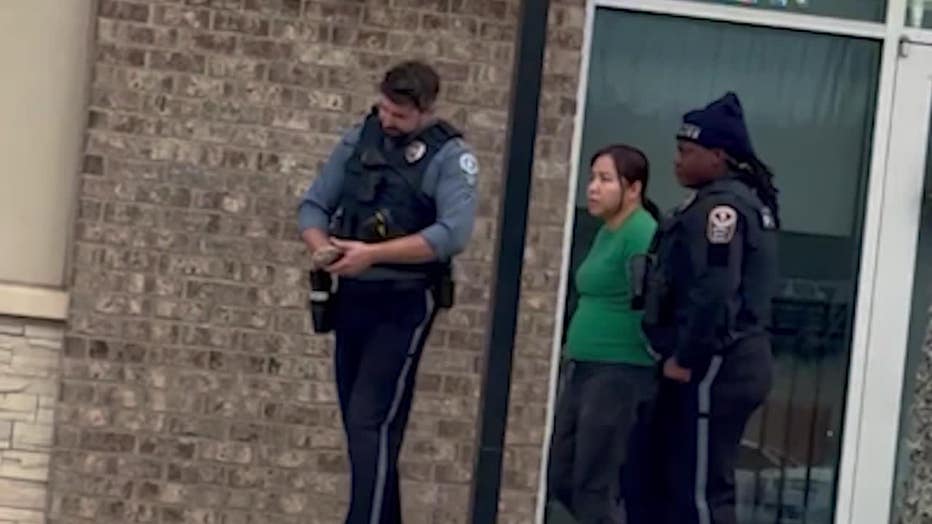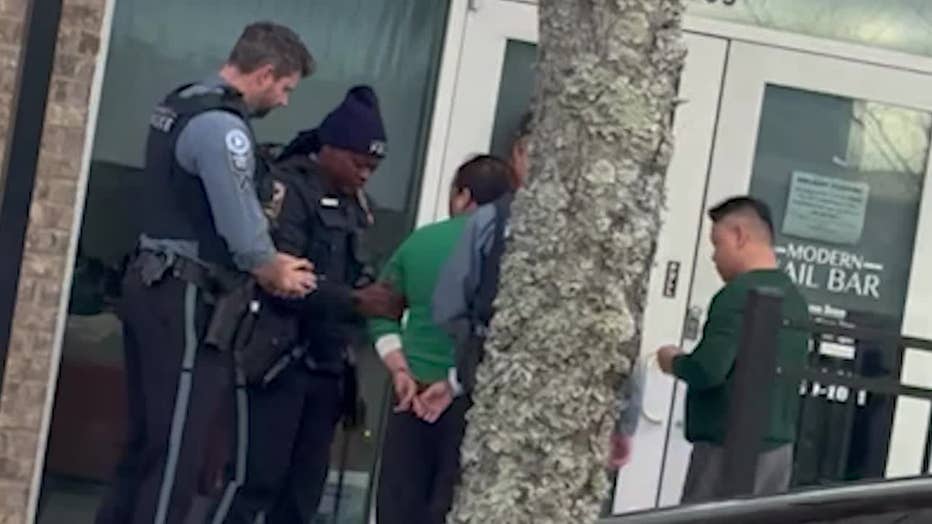A Gwinnett County nail salon employee is taken into custody by police outside a Lawrenceville business after investigators say an 8-year-old child was unlawfully prevented from leaving during a dispute over a service bill on December 21, 2025. (FOX 5 Atlanta obtained permission from the rights holder)