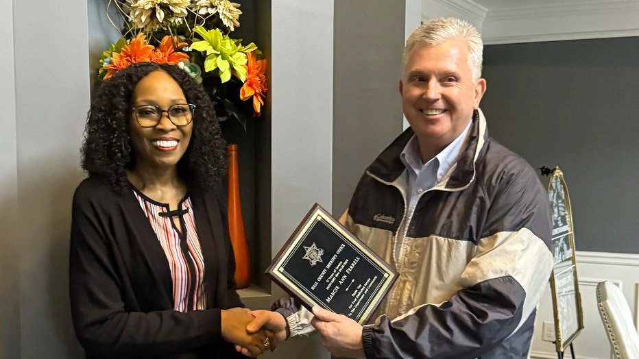 Sheriff Gerald Couch presents Marcie Ann Walker-Ferrell-Williams with a plaque of appreciation during her retirement celebration (Credit: Hall County Sheriff's Office)