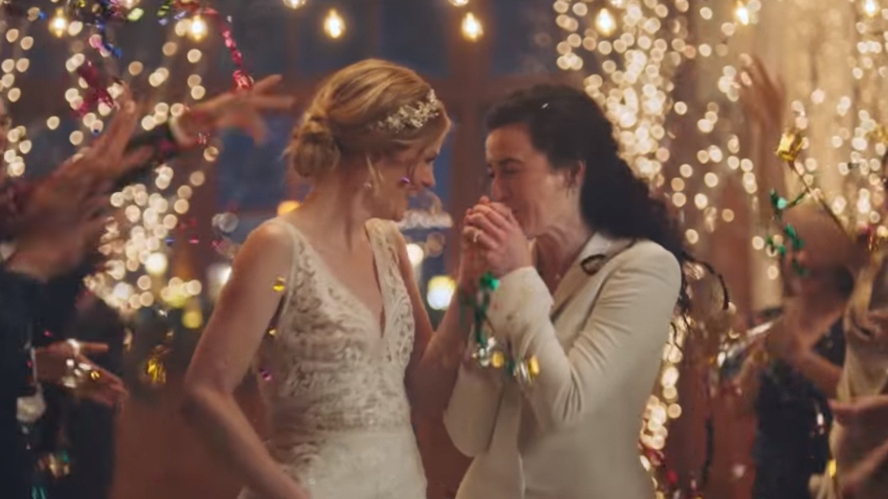In one of the pulled ads, two brides stand at the altar and wonder aloud whether their wedding would be going more smoothly if they had used a wedding planning site like Zola. The lighthearted ad ends with the two brides sharing a quick kiss on the altar.