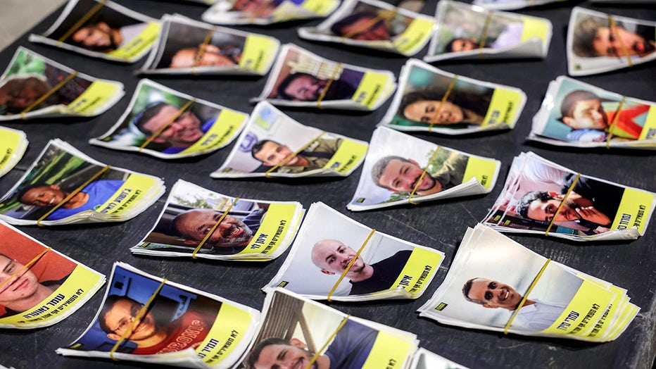 Pictures of Israeli hostages are displayed during an anti-government protest in Tel Aviv on September 27, 2025. (Photo by JACK GUEZ/AFP via Getty Images)
