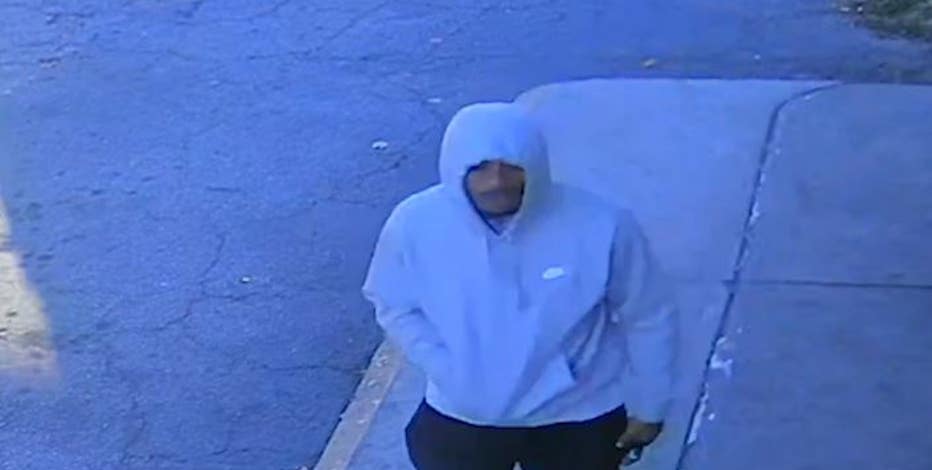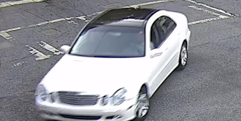 Police released video of a vehicle and person of interest. In the video, a white sedan with a black roof and a black male wearing a gray hoodie, black pants, and black and white Nike shoes, are items of interest.