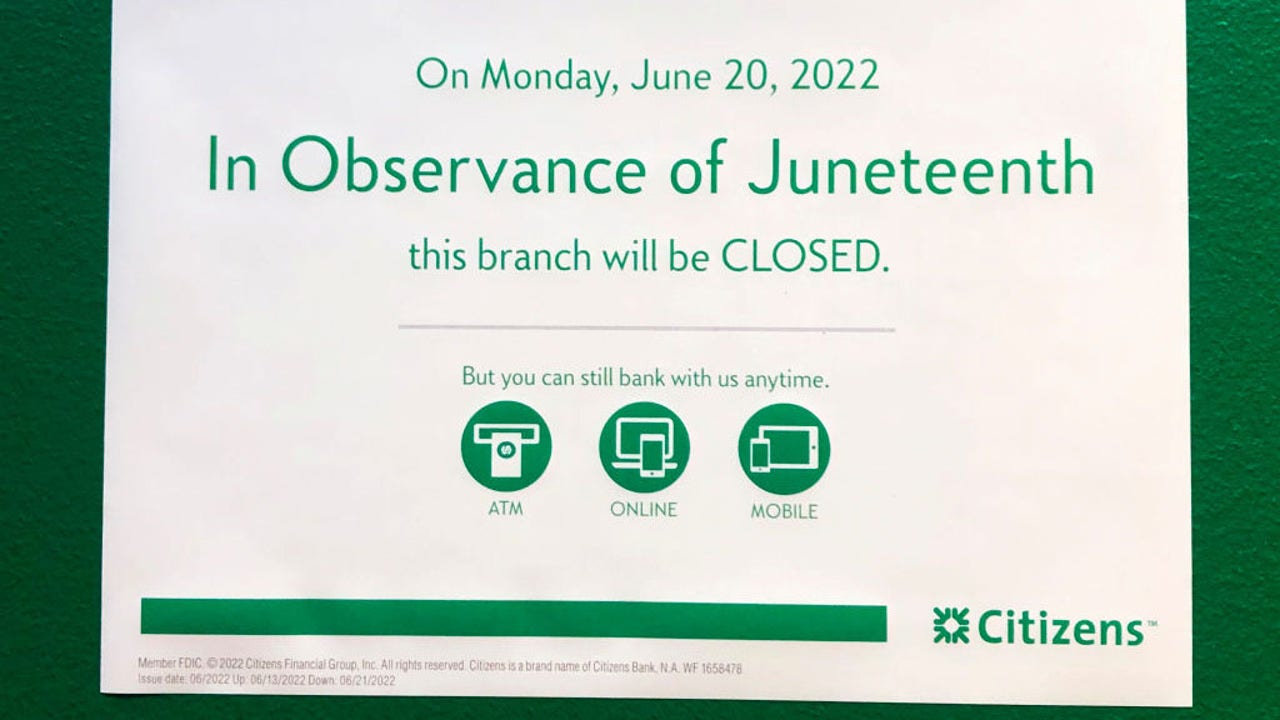 The Federal Reserve is observing Juneteenth on Monday, which means most banks will be closed.