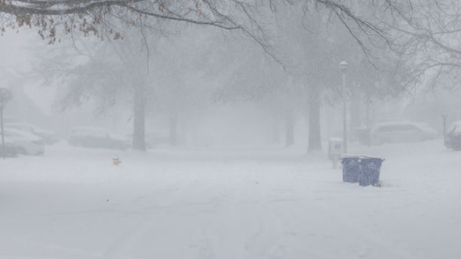 FILE - ire tracks fill up as dense snow fall and wind reduce visibility on Jan. 5, 2025 in Shawnee, Kansas. (Photo by Chase Castor/Getty Images)