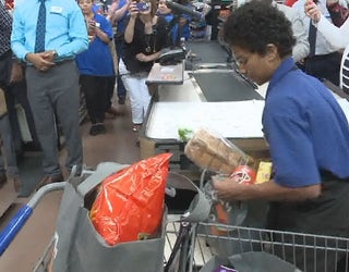 They manned the checkout lines at the Glenwood Avenue store in Atlanta Wednesday as part of the 22nd annual Kroger Georgia Bag-Off.