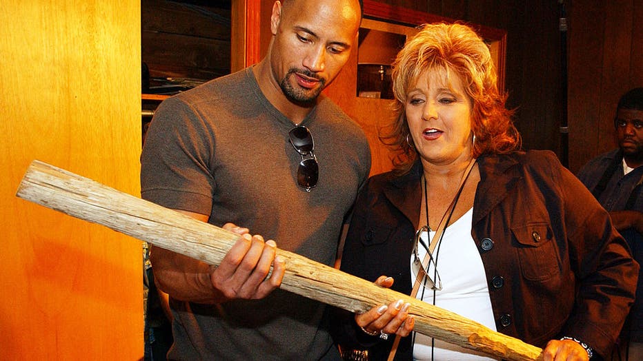 Dwayne"The Rock"Johnson and Dwana Pusser during The Rock Visits Sheriff Buford Pusser's Hometown at Mcnairy County Courthouse in Adamsville, TN., United States. ***Exclusive*** (Photo by R. Diamond/WireImage)