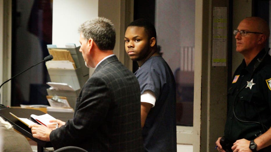Malachi Love-Robinson of West Palm Beach, Fla., looks over at his grandfather during his first appearance court hearing on March 2, 2016, at the Palm Beach County Court Criminal Justice Complex in West Palm Beach. (Adam Sacasa/Sun Sentinel/Tribune Ne